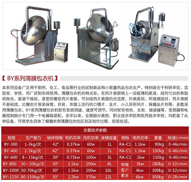 BY300型系列薄膜包衣機,是我廠近三年的改進型產品,本產品配有變頻調速,速度可在每分鐘5-50轉之間調整。本機同時配有噴槍、支架、裝液瓶等,變頻器和電器控制部分專門用一個電器箱裝配。該產品廣泛用于制藥、化工、食品等行業的試制新品和小批量藥品包衣生產,特別適合于科研單位、實驗室、學校、藥廠試制車間使用。三年來,全國部分職業技術學院和中等醫藥技術學校,均配備了此種設備,可使學生具體了解糖衣和薄膜包衣的區別及制作過程,很受歡迎。