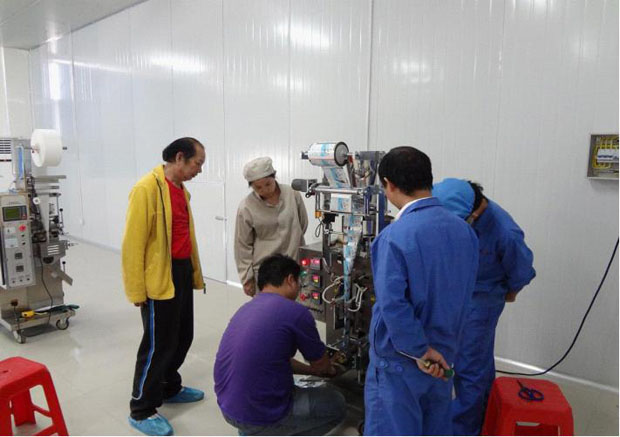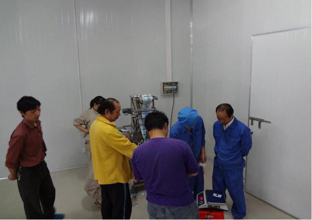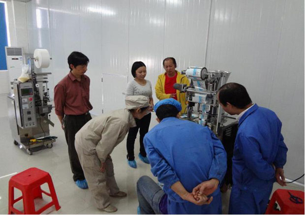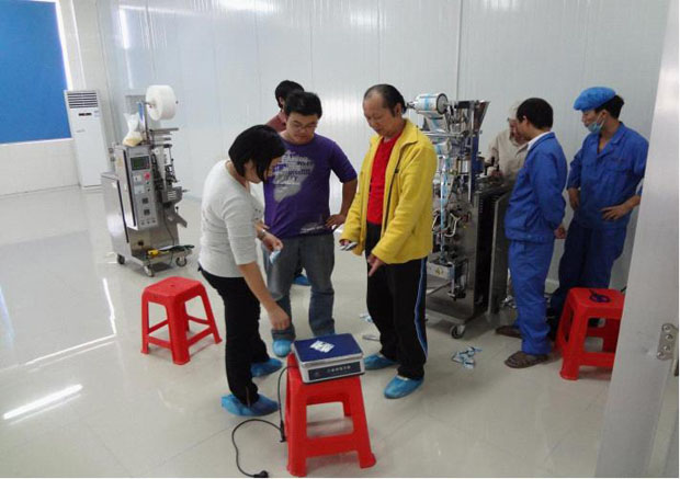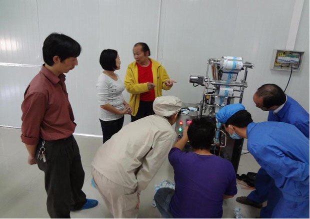 圖為千金養生坊健康品股份有限公司生產部黃玲芳主任率員工驗收ZKB-K顆粒包裝機實況。