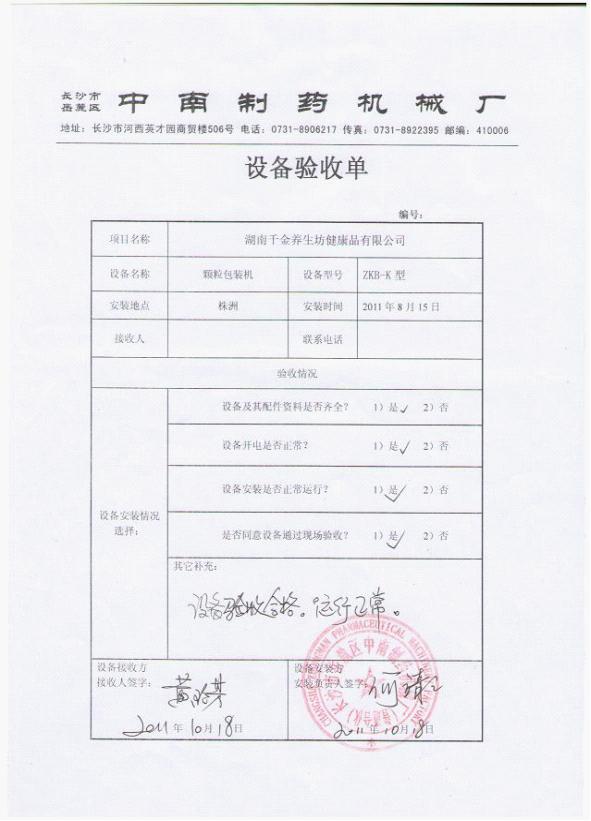 湖南株洲千金藥業是一家上市公司,主要生產婦科用藥。2011年10月,該公司月向我廠購買了ZKB-K型顆粒包裝機、DZ-60型全自動制丸機、LM型煉蜜機、RXH-48盤熱循環烘箱、KZ-180型快速整粒機、CH-200型混合機、YK-160型重型顆粒機、GF-30B型帶除塵渦輪自冷式粉碎機組等設備。現已投入使用。